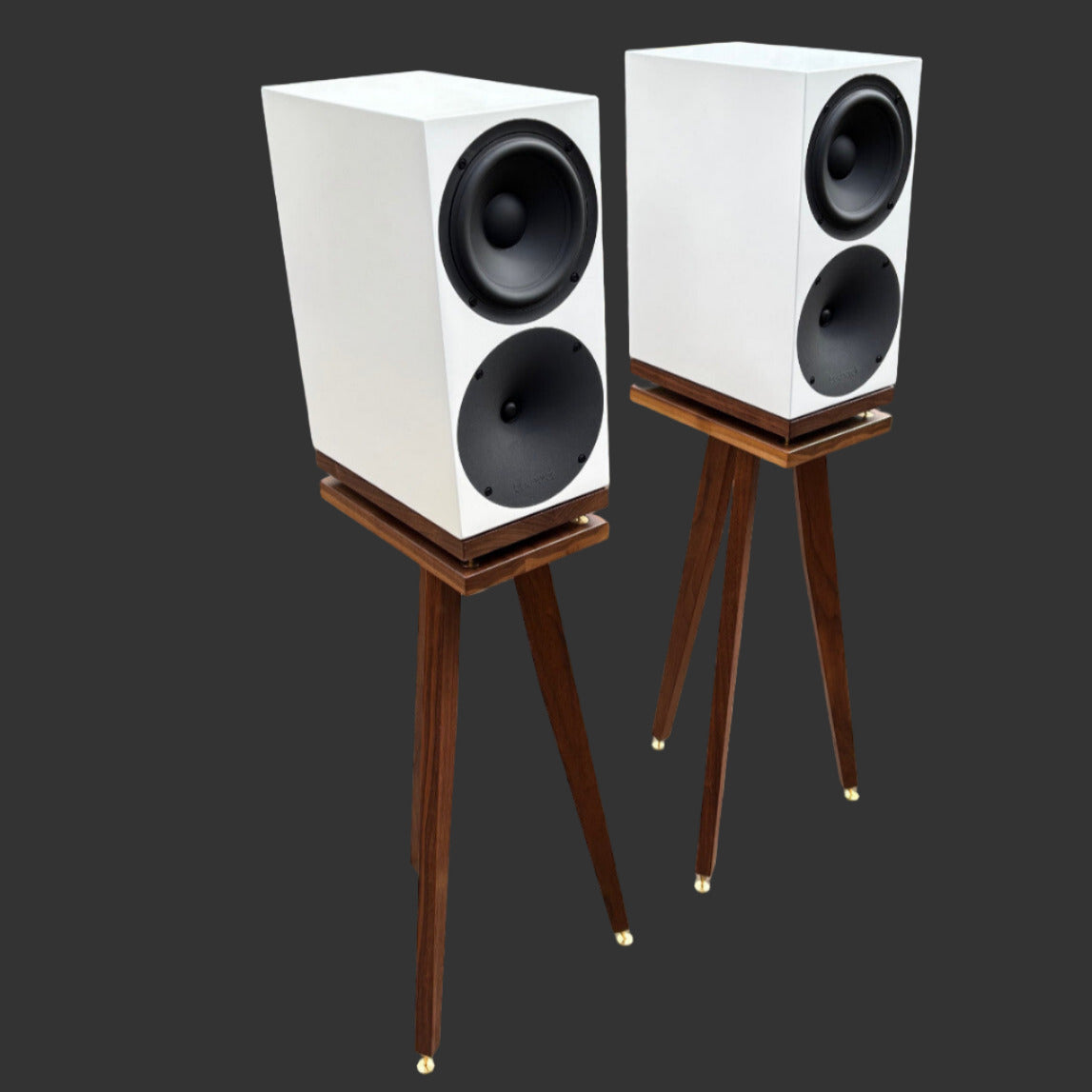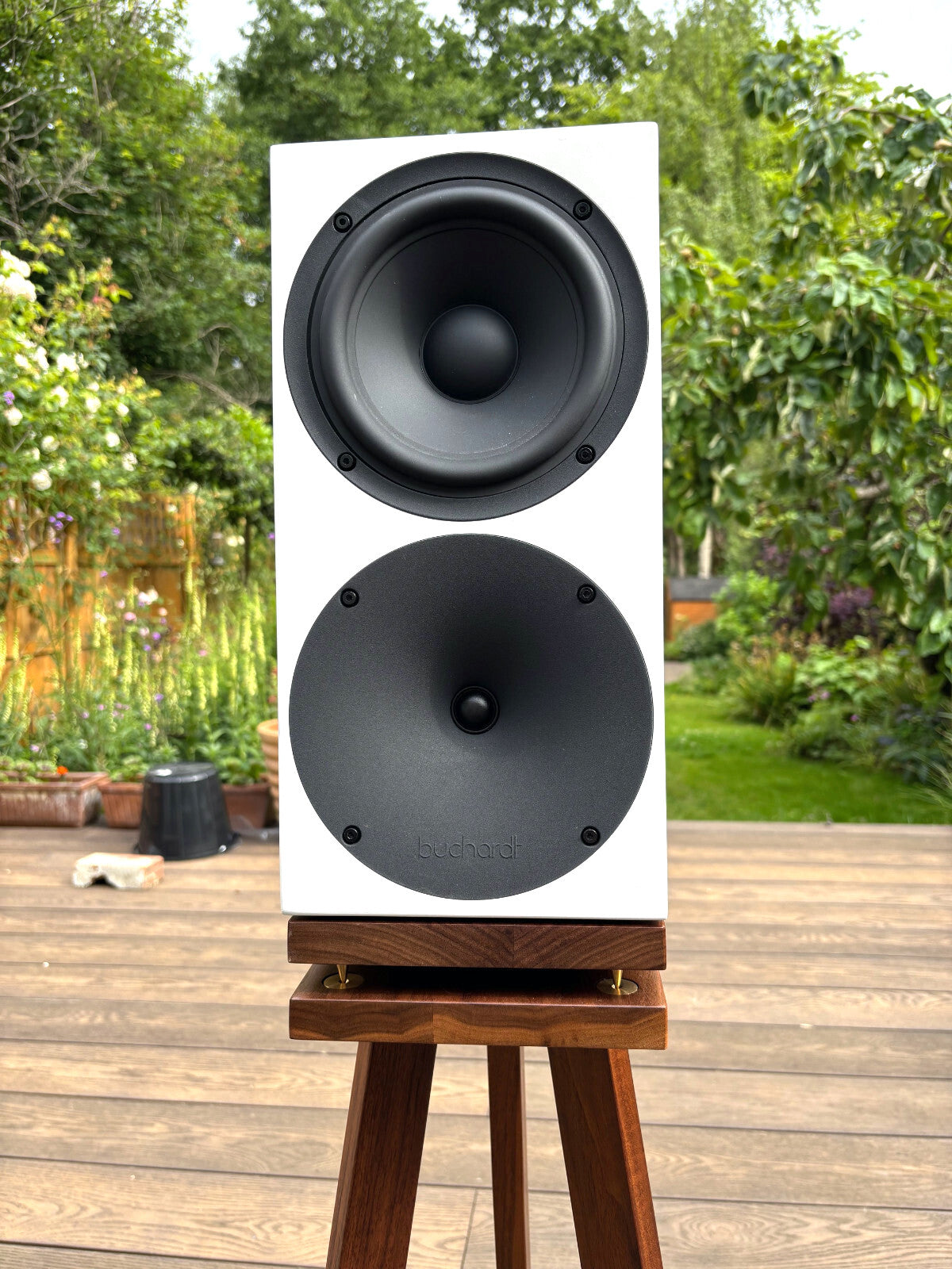Pair of white Buchardt S400 MKII speakers on wooden stands