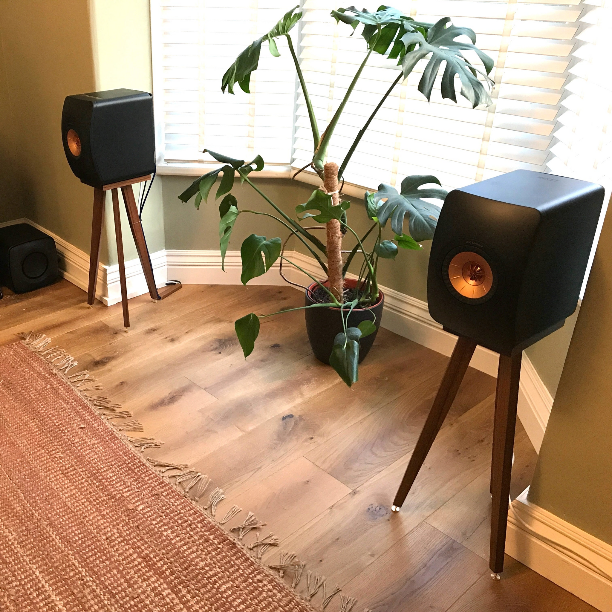 Room with KEF-LS50-Wireless-650-Oak-speaker-stands-by-audio-chic, a plant, and a rug.