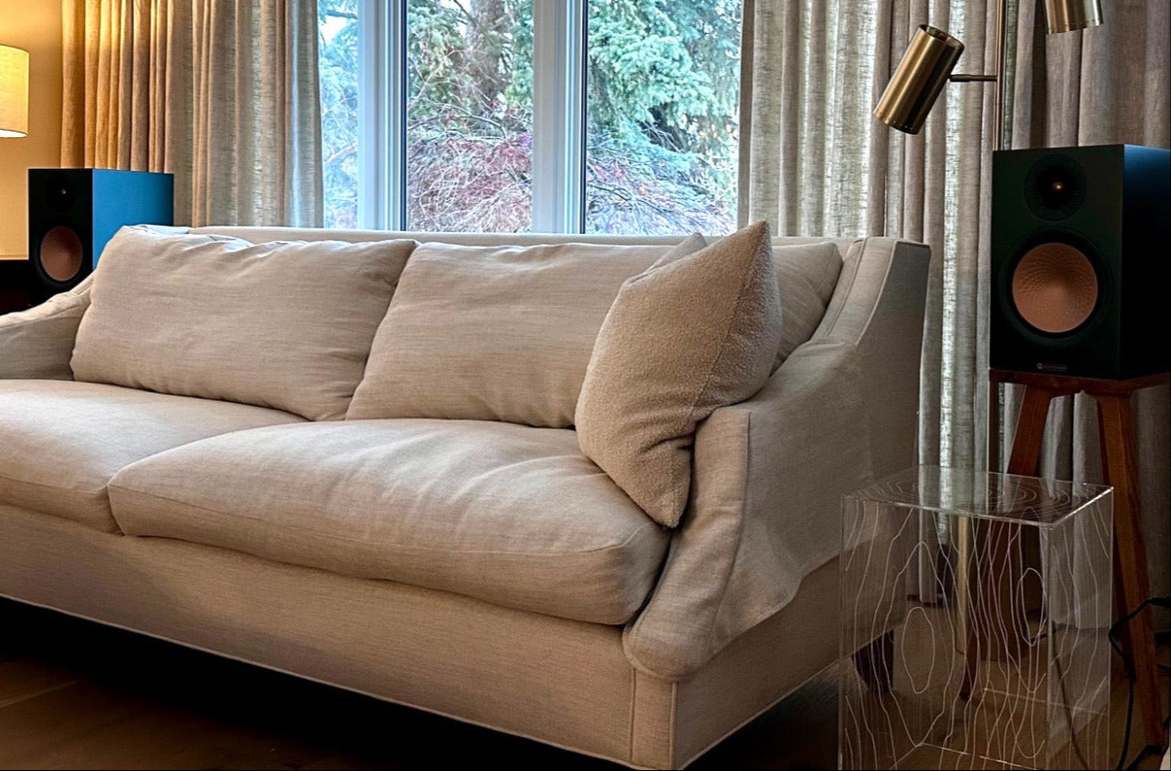 Beige sofa in a living room with curtains and Monitor Audio Siver 100 speakers on audio chic speaker stands in walnut.